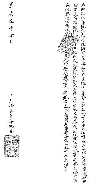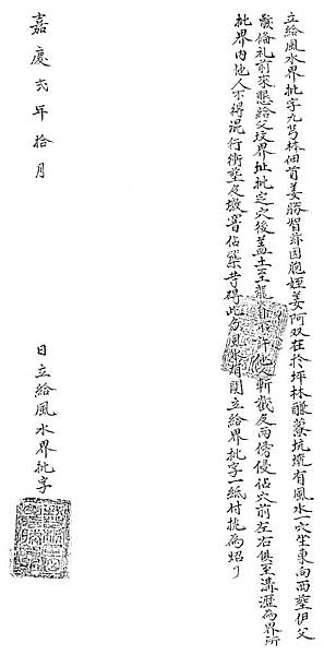 嘉慶六年七月下山水坑九芎林佃首姜勝智立給風水界批字