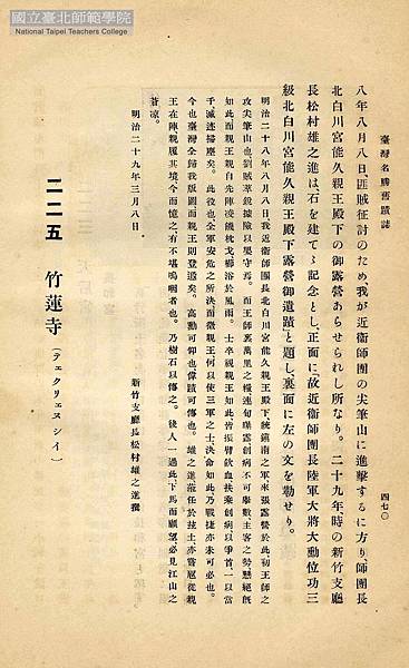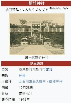 新竹神社-祭政合一/「鬼瓦」與懸魚/靖廬+北白川宮能久親王/開拓三神(大國魂命、大己貴命、少彥名命)「造化三神」( 天之御中主神、高御產巣日神、神產巣日神 ) /牛埔山御露營記念碑正面刻有「近衛師團長陸軍大將大勳位功三級北白川宮能久親王露營蹟」字樣,而背面碑文為 : 「王師之攻尖筆山也 劉賊萃銳據嶮 以嬰守焉 親王躬親先陣 凌肌枕戈 櫛沐風雨 士卒視親王如此 皆振臂決戰 能速奏戰捷 臺灣已平定 而親王則薨去矣 雄之進蒞任於茲土 亦嘗扈從親王 在陣親履其境 今而憶之 有不堪嗚咽者也 乃樹石 以傳之後人云 明治二十九年三月八日 新竹支廳長 松村雄之撰 」+「追擊奏功休我兵,典肱山阪待天明;日中炎熱全消盡,月下露營千感生。」-姜朝鳳宗族|痞客邦 https://bit.ly/3pcQQjq