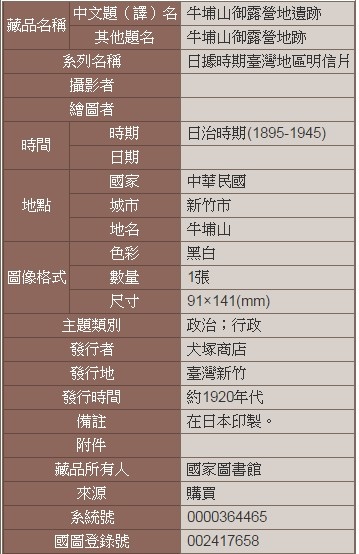 (新竹名勝) 牛埔山御露營地跡;日治時期繪葉書 · (新竹名勝) 牛埔山御露營地跡 · 國立臺灣大學圖書館數位典藏館 https://bit.ly/42wZvCV