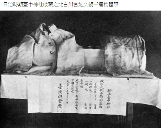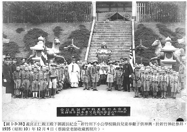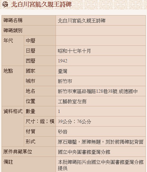 根據新竹市政府於2003年出版的《市定古蹟新竹神社調查研究暨修復計劃》所收錄的北白川宮能久親王