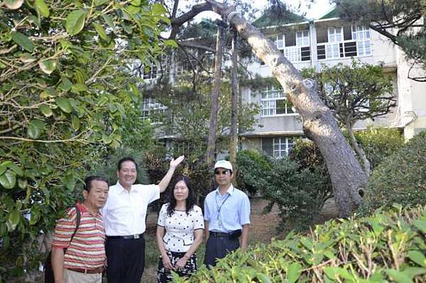 近來因樹幹傾斜並出現枝幹有中空的現象,市府緊急以廢棄電桿支撐維護老松樹安全。