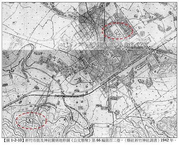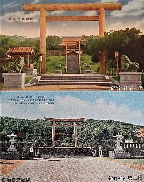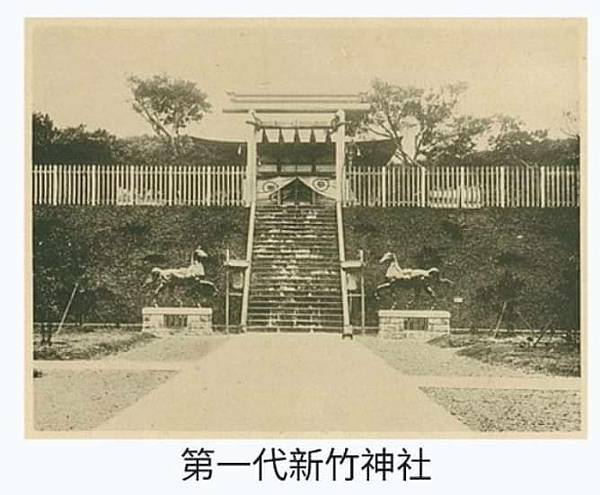 歷史沿革日本的神社體系大約可分成兩類,一為國家神道,一為民間信仰,前者是日本政府自明治維新後為了推行國家政策,讓人民深刻感受到新體制國家的誕生,所推行的宗教政策與措施,創造了國家神道作為傳統,以鞏固其領導核心;後者是日本自古以來就有的傳統信仰,屬於自然崇拜的一種。日本統治臺灣之後,這些宗教信仰隨著日本人來到臺灣,特別是日本政府透過宗教的力量來強化其統治,神社即是政策下的產物,在國家主義之下被建構的國家神道世界,透過神社空間的展現,達到天皇神化、穩固人心的目的。做為日本國家宗教-神道教信仰中心的神社,祭神主要有天照大神(日本皇室之祖神)、天皇及皇族、國魂神(守護國土之神靈)等,也就是將天皇神化,加以祭祀而產生的神明。新竹神社主祀昔年攻台陣亡的北白川宮能久親王,選定地址為崧嶺山半山腰處,北白川宮能久親王曾於1895(明治28)年,率兵攻打新竹尖筆山時,在這個地方紮營,因此選在其曾駐留過的「御遺跡地」建造神社,別具意義。新竹神社的興築始於1915(大正4)年三村三平擔任新竹廳長時,之後繼任的高山仰正式設立新竹神社造營事務局,由總督府技師森山松之助及其助手八阪志賀助、手島誠吾設計建造。第一代新竹神社於1917(大正6)年動工,次年落成,其他設施包括中門、拜殿、社務所、手水舍、鳥居等等,並於1920(大正9)年正式列為「縣社」。1942(昭和17)年社格再升為「國幣小社」。1936年後為強化皇民化運動,殖民者也從精神方面利用國家神道教來達到目的,神社成為教化的工具,為擴大規模,於1938年動土興建第二代神社,1940年完成,除了本殿之外,尚有祝詞舍、神饌所、神樂殿、休憩所、齋館等設施,還增加了參拜道、公共廁所等附屬工程。