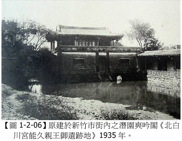 日治初期1895年北白川宮能久親王領臺灣屯駐軍近衛師團駐紮在新竹舍營所,初至夜宿潛園爽吟閣,