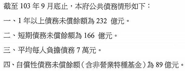 到今年六月底,銀行舉債部份為兩百八十三億元,加上公務預算與整體基金的負債額度,則有兩百九十二億元債務; 若再加上以前年度的歲出保留款,財政總缺口達三百八十四億元。
