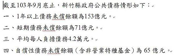 新竹縣政府財政處表示,目前新竹縣政府的長、短債債務比率各為四十四‧六七%、廿四‧五%,都已經瀕臨上限。