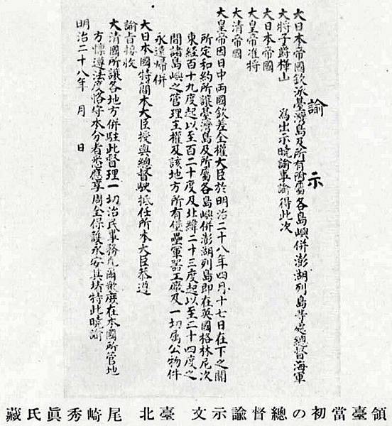 1896年(明治29年)3月31日,經10個月的全島軍事討伐後,台灣總督府條例及民政局官制公布。4月1日,軍政接管轉移為民政政治,台灣實行台北縣、台中縣、台南縣及澎湖島廳之三縣一廳制。司法事務由臨時軍事法庭,改由地方法院、覆審法院、高等法院的司法三院制度。