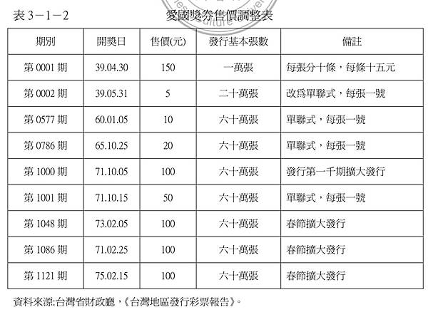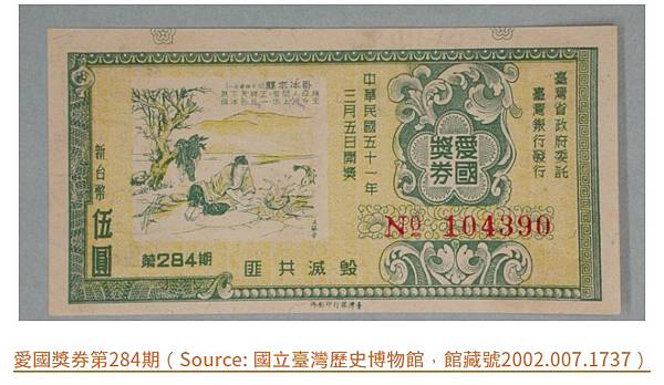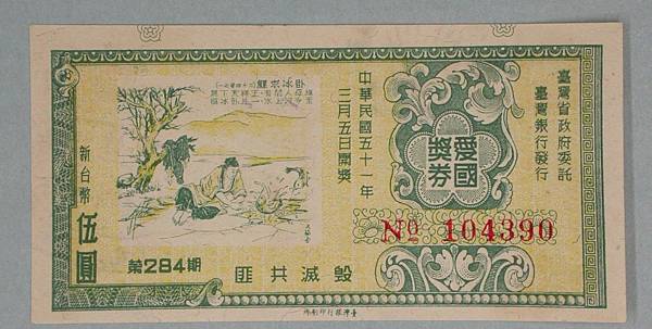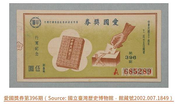圖片中是三張首期的愛國獎券,民國39年4月11日發行。當時每一張愛國獎券定價新台幣15元,上面印有編號與第幾條(每一個編號有十條),由臺灣省政府委託臺灣銀行發行、中央印製廠臺北廠負責印製。