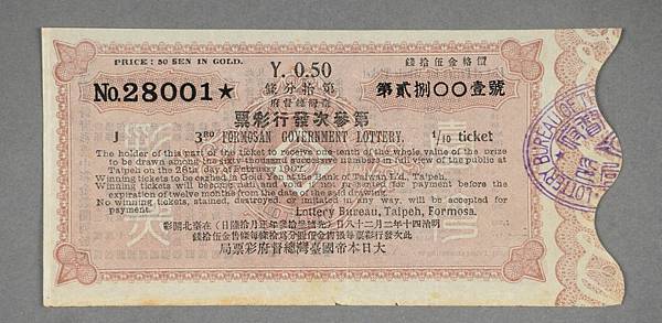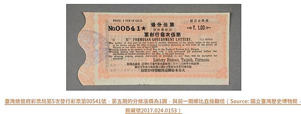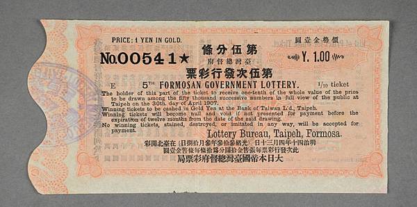 臺灣總督府彩票局第5次發行彩票第00541號,第五期的分條漲價為1圓,與前一期鄉比直接翻倍(Source: 國立臺灣歷史博物館,館藏號2017.024.0153)