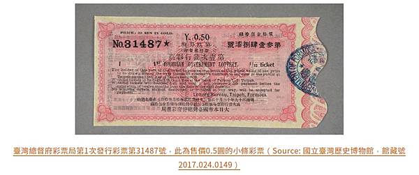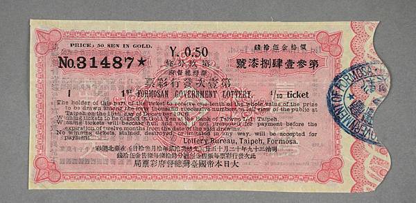 臺灣總督府彩票局第1次發行彩票第31487號,此為售價0.5圓的小條彩票(Source: 國立臺灣歷史博物館,館藏號2017.024.0149)