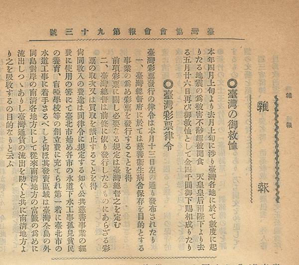 1906年《臺灣協會會報》第93號中,就刊出了臺灣總督府發布〈臺灣彩票律令〉的消息,臺灣終於有政府同意發行的彩票出現了(Source: 國立臺灣歷史博物館,館藏號2016.003.0093)