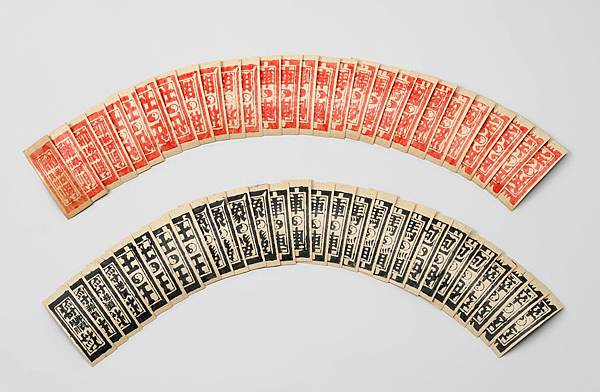 四色牌是用紙做成的牌具,印有象棋棋子圖案,牌身細長,剛好可用手指拿捏(Source: 國立臺灣歷史博物館,館藏號2004.001.0007)