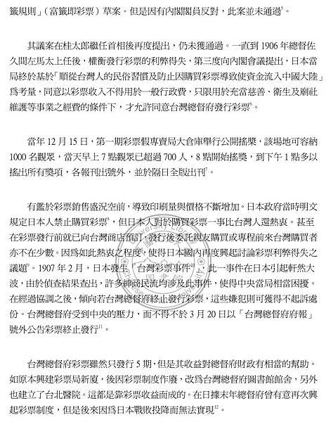 直到 1906年,因為日俄戰爭造成國家財政吃緊,中央才終於許可臺灣發行彩票案,總督府發布律令第七號「有關臺灣彩票之文件」。但此時後藤新平早已卸任民政長官,前往滿洲當鐵道總裁去了。