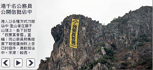 〔編譯顧佳欣/綜合報導〕香港佔中行動持續延燒,民眾以各種方式力挺佔中。一群登山者二十三日攀上香港「精神象徵」的獅子山,在四百九十五公尺高的山頂上,垂下六公尺乘以二十八公尺的巨型黃底黑字「我要真普選」直幅,引起網友瘋傳。而香港上千名公務員則集結買下香港明報整版以公開信挺佔中,更附上自己的證件,呼籲認同的公務員在臉書上連署支持。