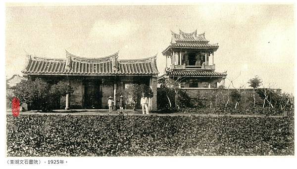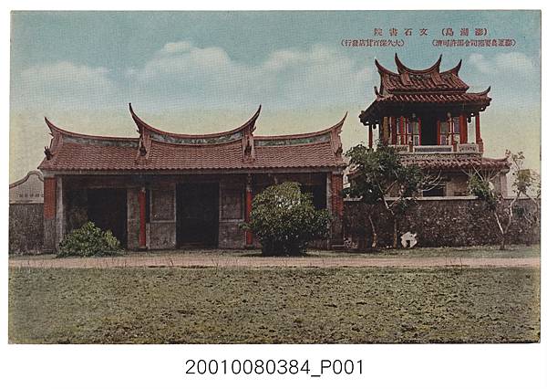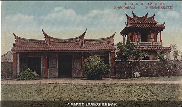 文石書院位於馬公市東郊,為乾隆31年(1767)澎湖通判胡建偉所創建,次年落成。文石書院初建時,頭門三間的中架構奉祀魁星之神,名「魁星樓」,而後易名為「登瀛樓」。日治時期,地方人士將書院改為孔子廟,為今澎湖孔廟。由於年代久遠,曾多次重修,至民國88年(1999)改建為今天所見新孔廟。 大久保百貨店發行澎湖島文石書院 - 藏品資料 - 國立臺灣歷史博物館典藏網
