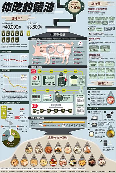 餿水油事件爆發後,國人驚覺生活中不少食物中都含油脂;其中,運用豬油加工製成的食品,從常見的泡麵醬料、貢丸、蛋餅,到傳統喜宴愛用的中式漢餅都有。這次劣質豬油事件,就有不少糕餅類百年老店中箭落馬。究竟我們吃到的豬油是如何產製、食用油脂會經過哪些政府部門及衛生標準的檢驗、國內豬油一年的產值與進出口量概況、政府的管理等,我們透過說聞解字,完整呈現豬油的各面向,從食安風暴中上一堂有關豬油的課。資訊圖表/你吃的豬油哪裡來? | 圖表看時事 | 國內要聞 | 聯合新聞網 - http://goo.gl/ojvyBz