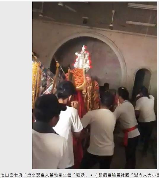 海山宮神轎破門進入舊教堂「收妖」。(翻攝自臉書社團「湖內人大小事」)
