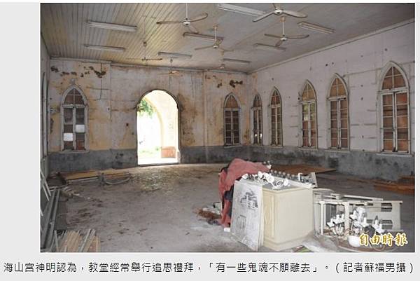 海山宮七府千歲上週赴中國泉州謁祖進香,前天在海埔地區舉行廟會瘟境活動,廟方人員說,當天下午3點多,太子爺和虎爺神轎經過海埔教會舊禮拜堂時,赫然發現「堂內很不乾淨」,可能是教堂經常舉行追思禮拜,「有一些鬼魂不願離去」,神轎因此破門而入,展開「收妖」。