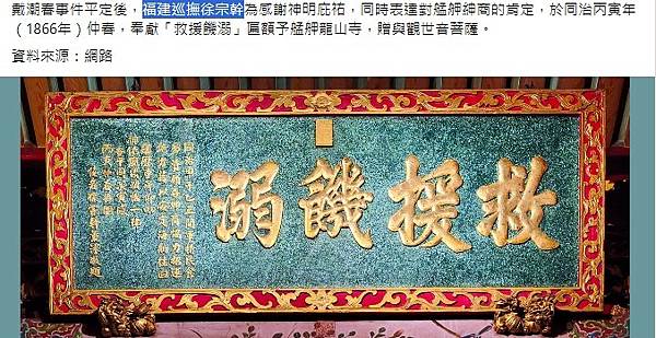 戴潮春事件平定後,福建巡撫徐宗幹為感謝神明庇祐,同時表達對艋舺紳商的肯定,於同治丙寅年(1866年)仲春,奉獻「救援饑溺」匾額予艋舺龍山寺,贈與觀世音菩薩。