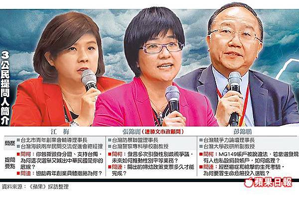 昨日辯論的公民提問中,包括青年創業會輔導理事長江梅、社團法人台灣競爭力論壇理事長彭錦鵬,與社團法人台灣防暴聯盟理事長張錦麗為連勝文陣營所邀的公民團體代表提問時,江梅對連勝文所提的問題為「青年創業的看法」、對柯文哲的提問卻是非常犀利的「撕毀身分證與支持台獨」;彭錦鵬對連勝文提問「出身政治世家,走過癌症和槍傷,你效法紐約市長彭博當個不支薪市長的理由」、對柯文哲則提問「MG149是台大院長說唯一違法的帳戶」。