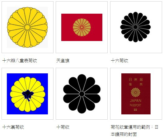 日本護照的封面上使用的是「十六瓣一重表菊紋」,與菊花紋章相似,菊花的花瓣數雖一樣,然而花的層數卻少了一層,跟皇室的菊花紋章並不完全相同。