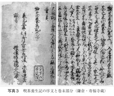 喫茶の効能や製法を述べた漢文体の書。上下2巻。禅僧栄西が承元5 (1211) 年著述。栄西が鎌倉下向の際,将軍源実朝に献上したもの。茶は仏教とともに中国から伝来したが,平安時代には上流貴族や僧侶の間で薬の一種と考えられ,長寿の妙薬とされていた。栄西も本書で茶の製法や効能を説き,喫茶による諸病の治療法を述べ,健康管理の必要を主張している。『群書類従』『大日本仏教全書』に収められている。