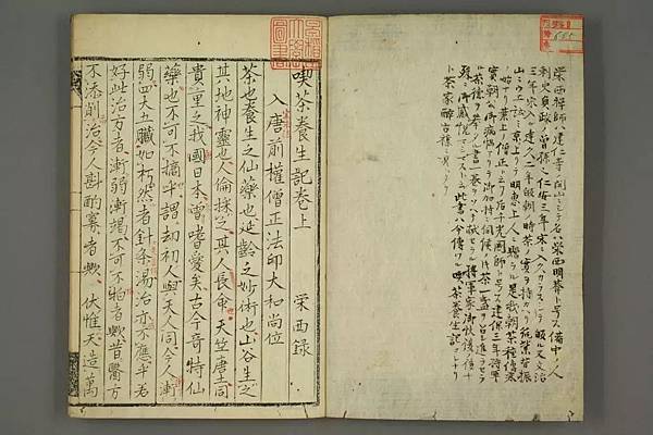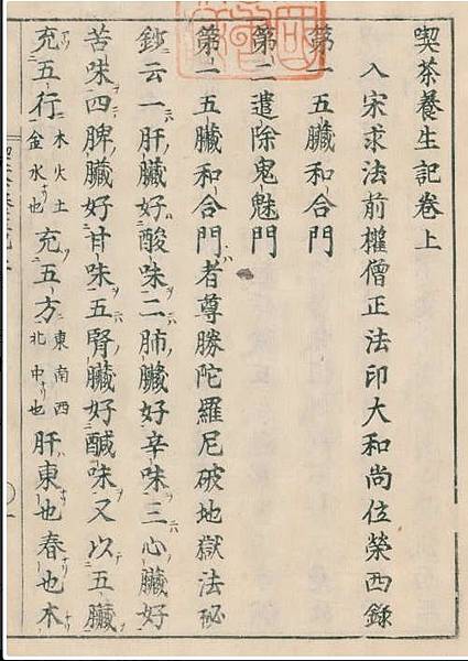 上卷開頭就說:「茶也,養生之仙藥也,延齡之妙術也。山谷生之.其地神靈也。人倫采之,其人長命也。天竺唐十同貴重之,我朝日本曾嗜愛矣。古今奇仙藥也,不可不采乎。」這段說茶葉的藥用價值和保健作用。接着用了中國陰陽五行辯證關係闡敘吃茶養生的道理。