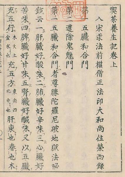 "以五髒宛五行,木、火、土、金、水也。又宛五方,東、西、南、北、中也。 肝,東也,春也,木也,青也,魂也,眼也。肺,西也,秋也,金也,白也,魄也,鼻也。 心,南也,夏也,火也,赤也,神也,舌也。脾,中也,四季中也,土也,黃也,志也,口也。 腎,北也,冬也,水也,黑也,想也,骨髓也,耳也。此五髒受味不同,一髒好味多入,則其髒強,克傍髒、互生病。其辛、酸、甘、鹹之四味恆有之,食之。苦味恆無,故不食之是故。四髒恆強,故恆生病(其病日本名雲心助也)。若心髒病時,一切味皆異,食則吐之,動不食萬物。今用茶則治心髒,為令無病也。"
