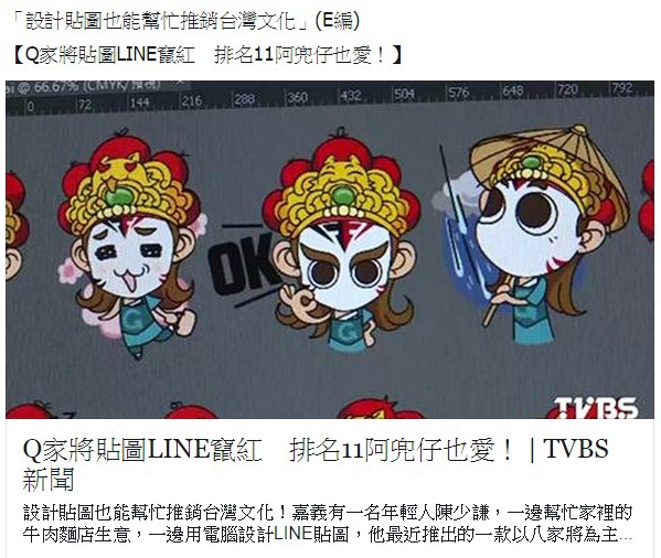 設計貼圖也能幫忙推銷台灣文化!嘉義有一名年輕人陳少謙,一邊幫忙家裡的牛肉麵店生意,一邊用電腦設計LINE貼圖,他最近推出的一款以八家將為主角的Q小將貼圖大受歡迎,不但在貼圖榜上排名第11,不到一個月就賺進5萬多元,連國外都有這款貼圖的粉絲!
