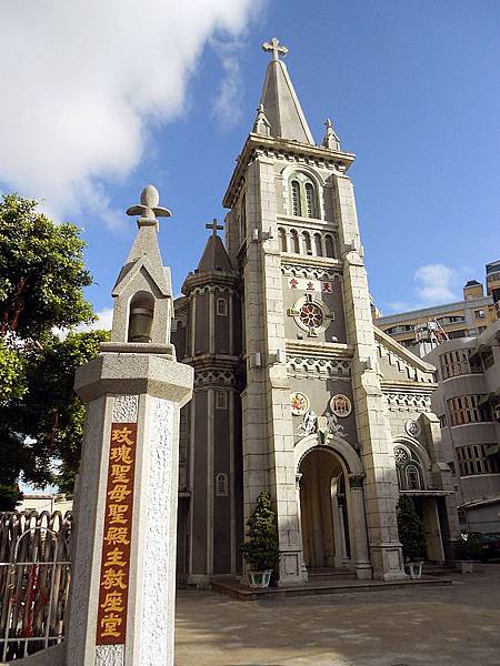 始建於1859年(咸豐9年)的高雄市玫瑰聖母堂,則是臺灣第一座天主教堂,1928年(昭和3年)改建為仿哥德式的建築,並混合部分羅馬風格,整體呈現厚重、向上垂直發展的線條。牆體有許多扶壁,正面的牆壁上凸出四根裝飾柱,入口為半圓形拱門,正面尖塔極為高聳,三角山牆上有一座六角形鐘樓,主塔左右附有八角形之衛塔,塔頂上有十字架,造型與萬金聖母殿相異。而其內部則以七對柱子分成中殿及兩側通廊,通廊上還有夾層,而夾層及天花板皆以交叉拱筋構成,是模仿石構造之裝飾。此外,其彩繪玻璃和裝飾繁複的玫瑰窗,也是一大特色。正門上方,同樣有清代「奉旨」石碑,由兩位飛翔的天使護持著。