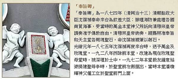「奉旨碑」為1874年(清同治13)清朝船政大臣沈葆禎奉命來台為欽差大臣,辦理海防兼處理各國商貿海事,受當時的萬金本堂神父所託向清穆宗皇帝請奏准予傳教自由。