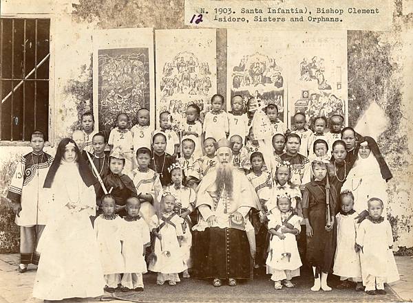 1903年打狗前金的玫瑰聖母教堂,黎克勉神父(Isidoro Clemente)與修女及孤兒合影。後方牆面有天主教的掛畫。