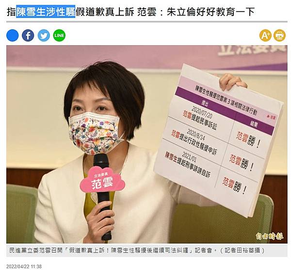 范雲則在臉書發文痛批,國民黨事發後對性騷擾的回應,就是持續的羞辱、嘻笑、抹黑,完完全全符合性騷擾加害者的慣用手法。陳雪生被控肚頂背後性騷擾 要賠范雲8萬元 - 臺北市 - 自由時報電子報 https://bit.ly/3yCC0Jl