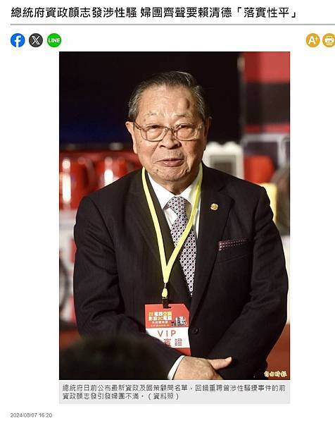 總統府資政顏志發涉性騷 婦團齊聲要賴清德「落實性平」 - 生活 - 自由時報電子報