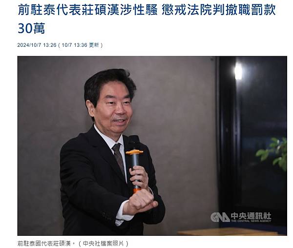 前駐泰代表莊碩漢涉性騷 懲戒法院判撤職罰款30萬 | 社會 | 中央社 CNA