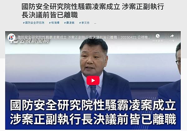 國防安全研究院性騷霸凌案成立 涉案正副執行長決議前皆已離職 | 公視新聞網 PNN https://bit.ly/4jGn4zZ