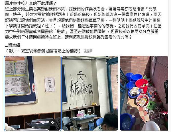 女學生並提到:「後面他們越來越囂張,不做打掃工作,甚至破壞公物,使得班級環境髒亂,瀰漫惡臭,還有果蠅到處亂飛,學生甚至造反拿椅子、手機箱砸班導,這樣的班級待下去真的不會出問題嗎?學校只是一直拿在處理了,來讓我們閉嘴,家長不滿到學校討公道,甚至有教官還在別的班級拿這件事出來說『有些事情應該先讓教官們知道,而不是先告訴家長』這樣的教育真的正確嗎?請問學校就是這樣的態度嗎?一直說案件在處理了,卻只有幾次約談,也沒有明確公布相關處理措施,連一個心靈輔導的機會都沒有,這就是一所公立高中對於霸凌、性平事件應該有的態度嗎?」