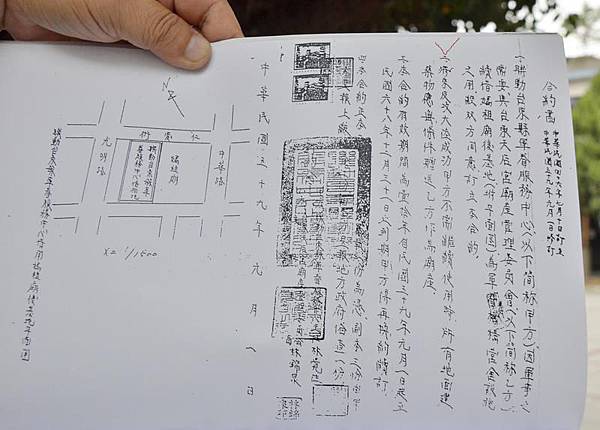 國防部40年代向台東天后宮借地蓋房舍,承諾反攻大陸 後歸還。天后宮認為台灣已「商業」反攻大陸,希望要 回房舍,提起訴訟。圖為國防部與天后宮當年簽訂合約 。 中央社記者盧太城台東攝 103年11月18日