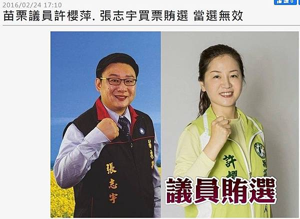2016年苗栗縣五合一大選,苗栗縣議員許櫻萍(民進黨)、呂明亮(無黨籍)、張志宇(國民黨)在選舉期間,涉嫌透過樁腳買票賄選。今天(24日)台中高分院判決3人當選無效定讞 https://is.gd/CJKkPg