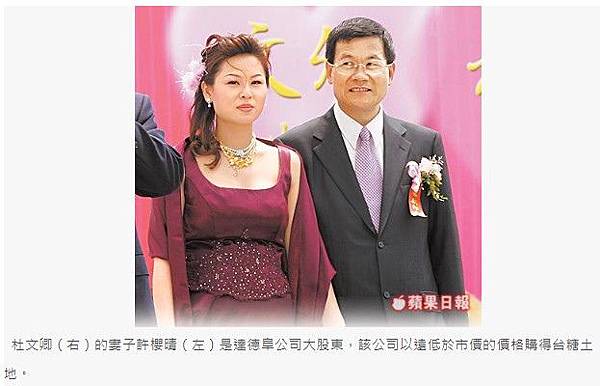 台糖前年十月賤賣苗栗國立聯合大學旁約一千七百三十坪土地。經查,購地的達德阜公司,大股東是民進黨立委杜文卿妻子許櫻晴(時為杜女友),買地價格是一億一千兩百二十二萬元,達德阜拿到產權後即設定抵押取得合作金庫一億零五百六十萬元貸款,核貸比率達九成四。 https://is.gd/thS9BH