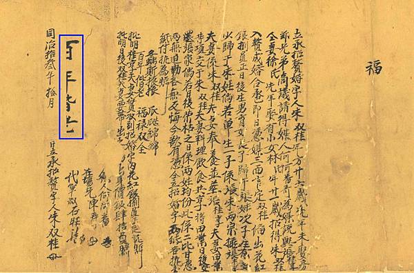 圖3為同治13年(1874)10月朱雙桂立承招贅婚字。黃色契紙上書寫朱雙桂入贅張家,與張桂享夫婦先前所娶的林氏婚配,日後若有生兒育女,除了長子需歸張姓,其餘的子女歸朱姓,若僅生一子,則需繼承張、朱兩姓宗祧。此外,還需料理張桂享夫婦生時奉養與死後喪葬事宜。文末以「百年偕老」騎縫字,期望兩人婚姻美滿,雙方各執一紙為憑。傳統社會的婚姻關係,往往不因愛情而產生。婚姻的目的不在於個人的愛情有所歸,而是為了家庭的延續工作。女性除了藉由傳統的嫁娶婚走入婚姻,為了因應父家或夫家的期待,有時需以「小娶」的方式達成傳宗接代的目標。
