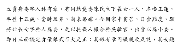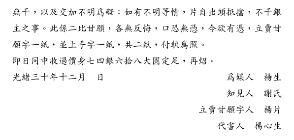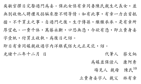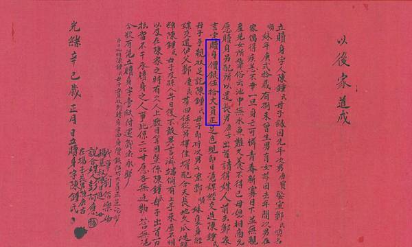 走入婚姻的女性若遇夫死,又無生養子女與遭遇夫家經濟狀況不佳等情況下,便如圖4的契約所示,需由夫家備銀贖身。圖4為婆婆陳鍾氏於次子患病過世後,在「母媳相商」後作主,於光緒7年(1881)1月立契,由次媳鄭順妹的父親鄭慶良以「贖身銀」50大員為代價,贖回女兒的人身自由。