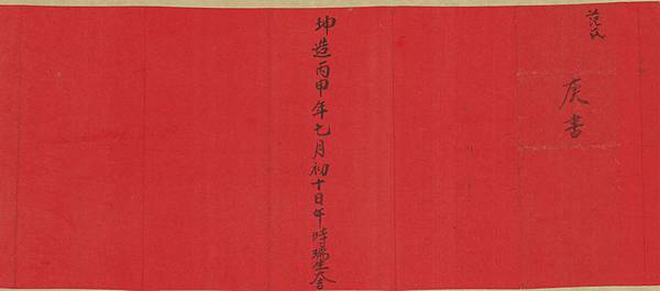圖2為記錄個人生辰時間的庚書,或稱庚帖;內容「坤造」二字,顯示為女方的庚書。一般在決定婚配前,女家會先將庚書交給男方,由其尊長焚香告神,置清水一碗於神座側,如無蟲蛾入水為吉;三日內家中平安,如無傷煞雞犬、毀壞器物事情,即認為吉兆。爾後,才由女家卜男子庚書,如係相配,才決定辦理訂婚事宜。