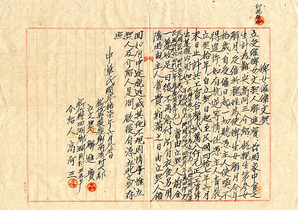 姚瑩的〈錮婢積習示禁碑記〉顯現了傳統女性被賣為婢,終身勞役事主,無法走入婚姻於夫家取得永居之地,死後不是子孫香火奉祀的對象,而是無所依歸的鬼魂。傳統女性在呱呱落地之後直到走入婚姻之前,在與男性作為家庭主要勞動力的功能對照之下,若遇家庭經濟困頓,往往成為優先犧牲的對象,被賣為婢。圖1的婢女僱傭文契,是民國37年(1948)6月30日新竹後龍的解進寶因家貧將10歲的三女解月給魏家為婢。由內容可知,解月需在魏家工作10年,總工資為舊臺幣28,000元。即使到了戰後,賣女為婢的現象依然存在。