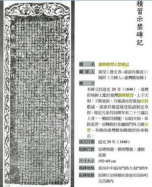 道光20年(1840)臺灣道姚瑩〈錮婢積習示禁碑記〉