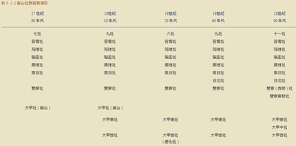 據此,不僅對崩山八社的方位關係有所陳述,也指出十八世紀四 O 年代的南日社,至遲六 O 年代已發展為日南、日北兩支社之事實。惟在官方的稅餉記錄上仍稱南日社。三 O 年代雖然由於大甲社的西社部落曾發動大規模的抗清事件,功敗垂成,部落勢力大受重創,且十八世紀九 O 年代清廷實施屯制以來,日北社轄理日北小屯,大甲社作為歷史上崩山社群的重要社群,仍屹立不搖。