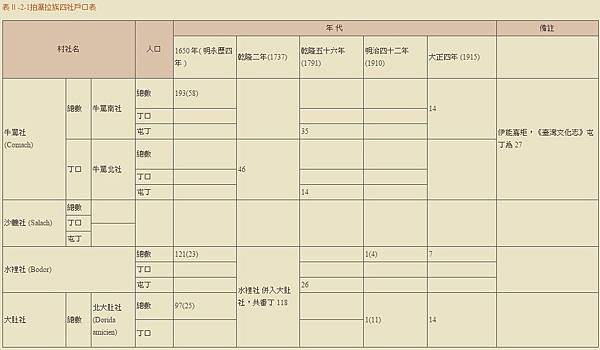 依據相關統計,十八世紀九 0 年代大肚山西麓的平埔人口共 669 人,(參閱表 Ⅱ -2 -1 )而漢人在六 0 年代中期的人口有 16,000 人。我們若以 16,000 人為準,漢人總數約為平埔人口的 23.9 倍以上。事實上,前舉四 0 年代大肚山西麓已有一個街市,若以牛罵街的人口規模為準,漢人合計有 4,000 人,則早在四 0 年代其人數已遠遠超過平埔人口( 669 人)。換言之,漢人人口居於台灣社會的多數,早在四 0 年代已開始。但漢人完全取代台灣社會的社經優勢,筆者以為應晚到八 0 年代左右漢人社會無視於非漢族群的威脅,並不斷發生集體械鬥之時。