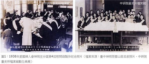 圖1為1938年3月29日臺中神岡筱雲山莊呂家八房呂季園之妻黃月(1889-1946,右圖箭頭所指者),參與愛國婦人會神岡庄分區第4回慰問袋製作時留影。慰問袋的製作與發送,源自日本國內;1901年3月2日,日本皇室及上層婦女因應戰事的發生,組成愛國婦人會,發動民眾將日用品、食品或慰問信等裝在一尺見方的布袋內,贈送給前方戰士,以示慰勞與鼓勵。