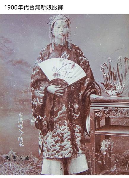 圖5是板橋林祖壽與清水蔡嬌霞結婚時拍攝的照片。照片中,蔡嬌霞身穿傳統中國嫁衣及霞披、頭戴鑲有珠簾的鳳冠,林祖壽穿戴清代長袍馬褂官服。一般說來,兩人的服飾為有官位的人才能穿戴。但自明代以後,庶民結婚時可假借九品官服為結婚禮服,這個習慣延續到清代。林、蔡兩家皆為豪門,才能負擔訂製如此華麗的結婚禮服,平民百姓,大多自行縫製嫁衣,沒有華麗的珠寶綴飾。