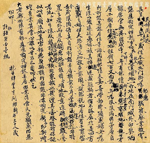 圖3: 周王氏控告林情夫妻之具呈(檔案來源:新竹周茶春號土地與訴訟文書,中研院臺史所檔案館數位典藏)