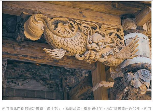 鄭用錫是清朝時期台灣第1位赴京考中的進士,又稱「開台進士」、「開台黃甲」,其家宅「進士第」後被列為國定古蹟,至今已有186年歷史,整座建物木雕十分講究,大門口上方的「進士第」牌匾為此次工程期間進行原比例仿作。